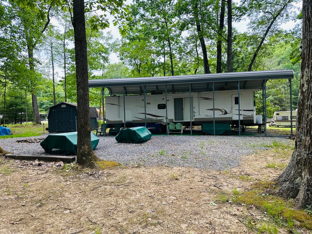 A Piece of Paradise! 38 Foot 2 Bed 1.5 Bath RV never seen the road-fully covered by heavy duty metal awning, Shed & Electric. Extra 2 RV outlet boxes for visiting family hookup GFI, 50 & 30 Amp in both. 260 Foot Well-Full Water filtration and softening system & Septic Tank. Located on 1 acre wooded lot with fire pit & picnic tables. Walk to Campers Paradise & close to ALL Clarion River activities