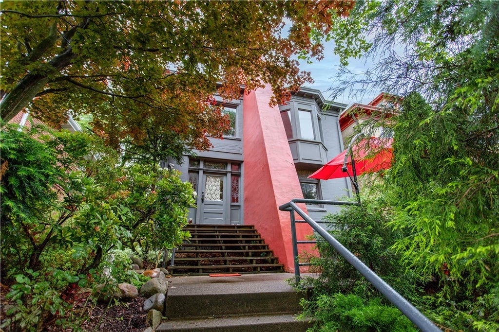Step into a true work of art at 6542 Dalzell Pl, where iconic architect Art Lubetz transformed a traditional residence into a dramatic & inspiring modern retreat. A bold architectural statement nestled in the heart of Squirrel Hill, this one-of-a-kind home combines geometric brilliance with functional living, offering a rare blend of bold design and comfort. Every line, angle, and window has been purposefully reimagined, creating dynamic light-filled spaces that surprise and delight at every turn. The exterior façade is a sculptural composition, while the interior continues the red wall & features open-concept living areas with soaring ceilings, playful sight lines, & curated architectural moments throughout. Highlights include a statement staircase that doubles as an art installation, spacious bedrooms that offer privacy while remaining visually connected to the home's flowing energy & private rear terraced perennial garden. The lower level has an in-law or airbnb 1 bedroom apartment
