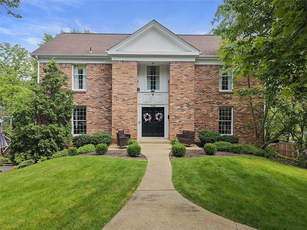 Beautiful brick colonial just blocks from Beverly Road offers timeless charm & thoughtful updates. Welcoming entry with powder room opens to sunken living room with hardwoods, 6' windows & original French doors to a 35' covered deck. Hardwoods & crown molding continue through the dining room with picture molding & on-trend wallpaper. The updated kitchen features dark granite, including on the island with seating & storage, Hi-end appliances, tumbled marble backsplash & French doors to the deck. Open-concept family room includes a built in media center, brick wood-burning fireplace flanked by window seats. Sunny primary suite with en suite & 11' walk-in closet. 3 additional 2nd level bedrooms share 2 separate "Jack & Jill" baths at landing. Walk-out lower level with gameroom/office, 2nd deck, laundry, 2-car garage & access to a 42x12 sub-basement - so much storage!. Both decks overlook the shady yard & creek, offering a private natural escape in a central, walkable location
