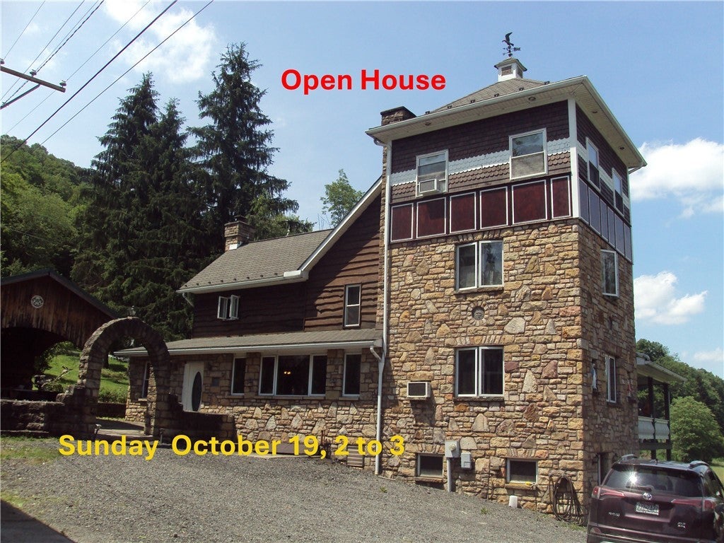 5 bedroom 2.5 bath stone and frame house. Kitchen is open to dining and living room. The dining room has a stone woodburning fireplace with a side cast iron stove. There is also a family room and bathroom-laundry on the first floor. There are 4 bedrooms and a full bathroom on the second floor. The third level has a 2 room bedroom suite. The stone cased large 2 story detached 2 car garage could easily have the second floor finished into an apartment as the first level already has a half bath and heat. There are also 2 other detached 2 car garages. In addition there is a small log house with stone fireplace and pond. The property also has a covered porch area with picnic table for outdoor dining.