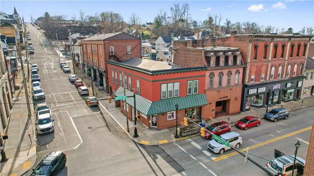 This well-maintained, all-brick, mixed-use building is perfectly situated in the heart of Monongahela. Positioned at the high-traffic corner of 2nd & W Main, it sees nearly 10,000 vehicles daily. The street level features three office/retail units, while the second floor offers two residential apartments. On the main level: a former tattoo parlor is now an open studio with a kitchenette and restroom and can be connected to the neighboring craft store. Granny Nannies includes a front office, back office, and restroom. Noel's Craft Shop provides a front retail area, two back offices, and a restroom. Upstairs: Apartment 204 is a beautiful 1 bed, 1 bath unit with in-unit laundry, an open kitchen/living area, and hardwood floors. Apartment 206 is another spacious 1 bed, 1 bath with in-unit laundry, a well-appointed kitchen, comfortable living space, and generous closets. Both units feature high ceilings for an airy feel. The clean lower level has its own street access & rental potential.