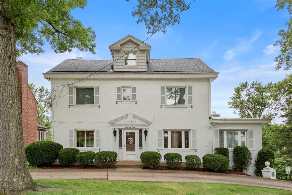Stately white brick colonial directly across from South Hills Country Club! This timeless beauty features a grand governor’s driveway and a second driveway leading to the rear garage. Inside, you’ll find a spacious living room with a decorative marble fireplace, a cozy sitting room, and a main-level half bath. The spacious eat in kitchen connects to a sunroom perfect for morning coffee and views. Upstairs boasts 4 spacious bedrooms and 2 full baths. The lower level is made for entertaining—finished game room with a brick gas Heatilator fireplace, full bar area, half bath, laundry, and walk-out access to the backyard perfect for outdoor entertaining or a sports court. Antique chandeliers add charm and character throughout. Classic elegance meets a prime location! New Roof installed May 2025!