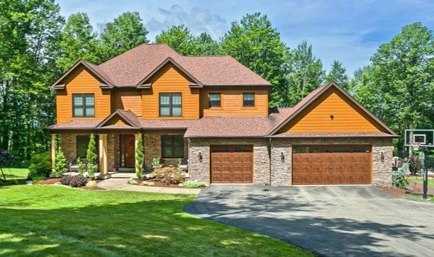 The exterior features Hardie board siding, stone accents, and an oversized 3-car garage plus a detached garage.