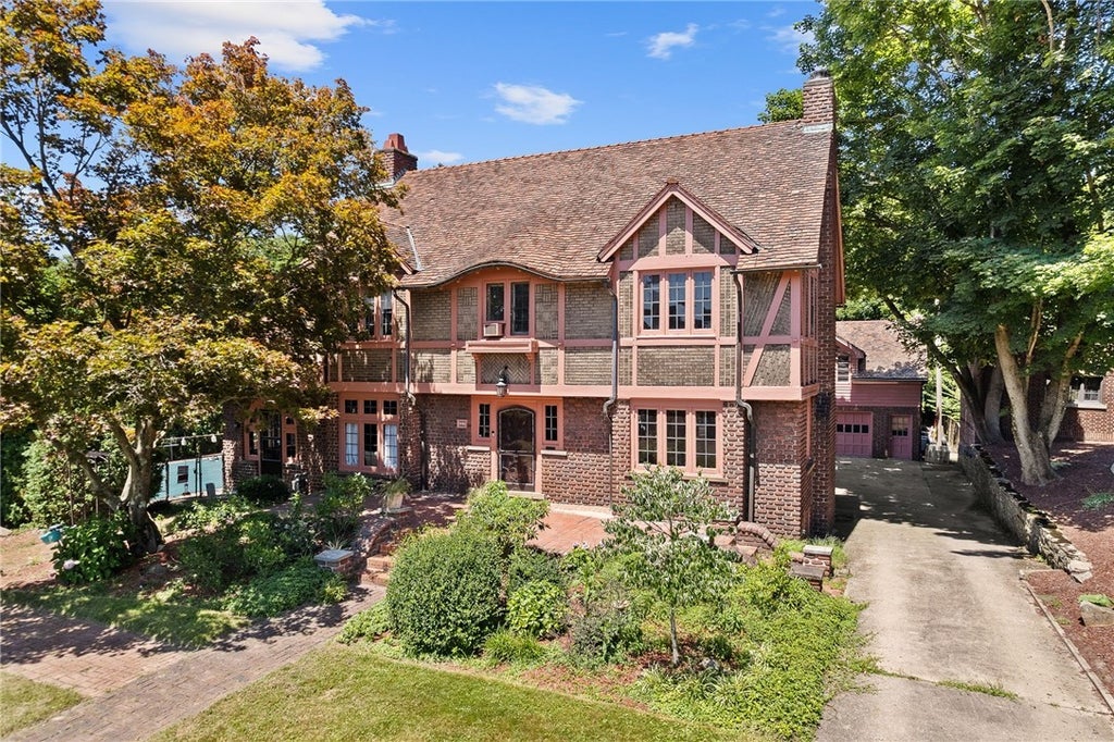 This stunning brick Tudor offers exceptional space and character across 3 expansive levels. The main floor welcomes you with a dramatic central staircase, setting the tone for the home’s classic appeal. You’ll find a well-appointed kitchen, butler’s pantry, formal dining room, 2 inviting living areas, and a spacious office with exposed brick and a half bath. The 2nd and 3rd levels each feature a private master suite, offering flexible living arrangements. The finished lower level includes a custom wet bar, media area, and dedicated workout space—perfect for entertaining or relaxing. Outside, enjoy a private, landscaped backyard with a large covered patio and custom in-ground pool. A fully equipped apartment above the detached three-car garage adds even more versatility—ideal for guests, family, or income potential. Rich in historic detail, the home features crown molding, hardwood floors, elegant light fixtures, glass doorknobs, high ceilings, and generously sized rooms throughout.