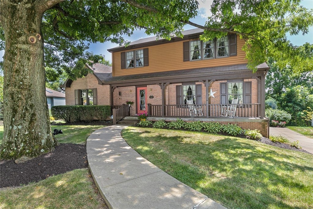This Kacin-built brick & cedar two-story home has been lovingly cared for by its original owner and offers timeless quality with modern comfort. The spacious layout includes 4 bedrooms, featuring a primary suite with a walk-in shower and closet - your own private retreat! Gather in the family room beneath a soaring 13' cathedral ceiling with a cozy wood-burning fireplace - perfect for relaxing evenings. The large eat-in kitchen and adjoining dining area open to a 31'x12' partially covered deck, ideal for entertaining, grilling, or simply enjoying peaceful views of the level backyard. Enjoy the convenience of first-floor laundry, generous living and dining rooms, and a welcoming foyer. The unfinished basement with rough-in plumbing provides room to expand - whether a game room or guest suite. A 2-car garage with workbenches and a cement driveway add everyday practicality. This home blends warmth, function, and possibility - all ready for its next chapter!