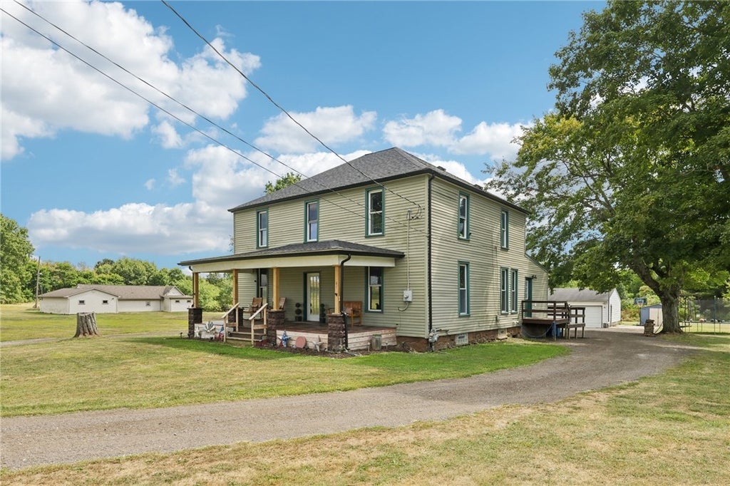 Set back along a picturesque tree-lined driveway, this beautifully renovated historic landmark farmhouse rests on over 4 scenic acres. The timeless character of the home shines through its two rustic stone fireplaces, one gracing the dining room and another anchoring the inviting living room, while thoughtful updates ensure today’s conveniences are at your fingertips. A welcoming front porch introduces the open floor plan, where natural light flows through oversized windows. The heart of the home is the dream kitchen, showcasing custom Hickory cabinetry, oversized eat-at island, and the warmth of the dining room’s stone fireplace wall. A main-floor bedroom and bath, plus a mudroom and first-floor laundry, add everyday ease. Upstairs, the private primary suite features a walk-in closet and office, joined by two additional bedrooms and a full bath. Modern improvements include an updated well and water system, roof, gutters, downspouts, HVAC system, and tankless water heater.