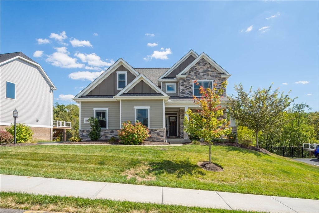 5 bedroom, 3.5 bath home blends timeless design & modern luxury. The main level offers an open concept with spacious great room featuring a floor-to-ceiling stone fireplace & walls of windows. A gourmet kitchen boasts a massive quartz island, luxury appliances custom cabinetry, and walk-in pantry, flowing seamlessly to the dining room & 30-foot partially covered trex deck. A dedicated home office, mudroom with custom built-ins & powder room complete this level.Upstairs the primary spa-like en-suite w/ custom tiled oversized Roman shower & gigantic walk-in closet. 3 additional bedrooms share a full bath, along with a laundry room. The finished walk-out lower level features a large entertaining area, 5th bedroom, full bath & storage room.Relax & enjoy sunrise views from the deck or patio overlooking the large, mostly level fenced yard w/ a private wooded backdrop. HOA covers weekly lawn care, mulching, seasonal clean-up, and snow removal, allowing you to enjoy free time with loved ones.