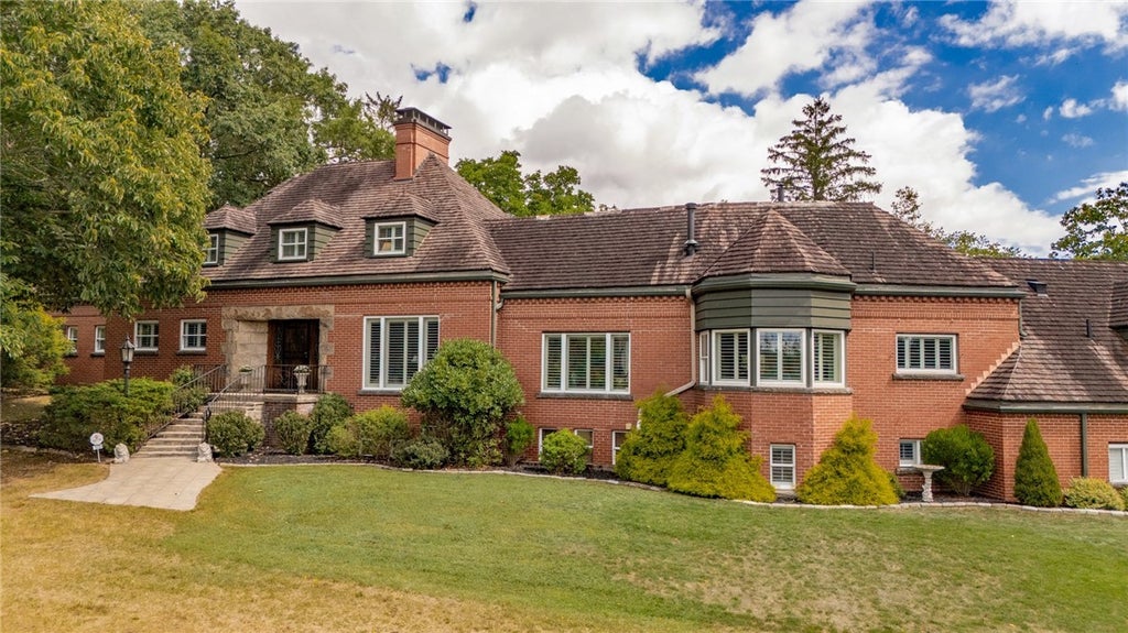 Perched above UPMC Greene in Waynesburg's East End, this English country manor sits on 2.97 scenic acres. Built with steel I-beams, concrete subfloors, a tile roof, and a brick-and-stone façade, it blends timeless craftsmanship with modern updates. The stone-framed entry opens to a dramatic spiral staircase with wrought iron and brass railings. The renovated chef’s kitchen offers white cabinetry, quartz counters, premium appliances, slate floors, and spacious pantry. A bright breakfast nook frames sweeping views of Waynesburg. Adjacent is a private mother-in-law suite with generous storage and updated bath. The dining and living rooms showcase Brazilian walnut floors, floor-to-ceiling windows, and crown molding. A turret room overlooks the yard. The first-floor primary suite includes dual walk-ins, dressing area, and bath. Upstairs, two rooms share a jack-and-jill bath. The lower level features a river rock fireplace and bar. Outdoors, enjoy a pond, stone grill, and entertainment area.