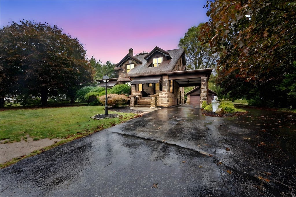 Welcome to a one-of-a-kind 1930s stone home that blends historic charm with modern convenience, all set on a beautifully flat and usable 2.69-acre lot. From the striking stone exterior to the orchard featuring apple, pear, and peach trees. Enjoy peaceful mornings on not one, but two spacious covered porches. The property also includes a detached garage and a wood shop with overhead storage. Inside, the home retains its vintage appeal with original hardwood floors, plaster walls, and elegant crown molding. The kitchen boasts stainless steel appliances, exposed brick, and classic tin ceilings that add timeless character. The primary bedroom offers a cozy fireplace fueled by FREE natural gas! Downstairs, the finished basement provides flexibility for any lifestyle, featuring a fourth bedroom, family room with another fireplace, a large bathroom, and laundry. Adding to the home’s unique history, pantry was once the Apollo telephone booth!