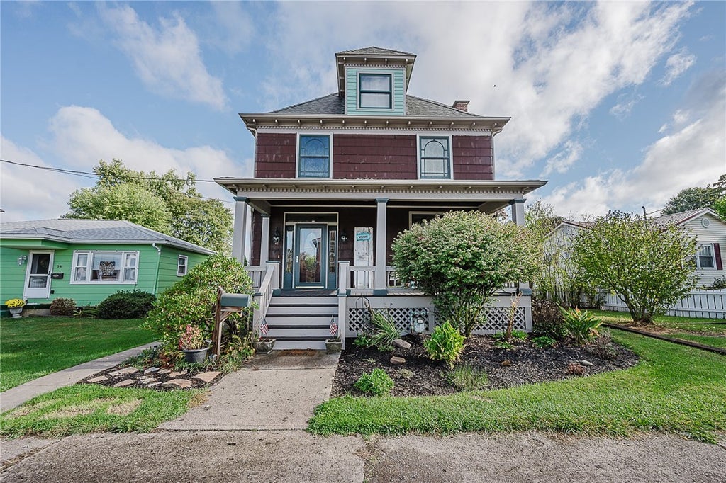Step into this beautifully maintained home, full of character and original charm. Hardwood floors, rich woodwork, and two sets of pocket doors highlight the timeless craftsmanship throughout. Tin and coffered ceilings add distinctive touches on the main floor, while a cozy gas fireplace brings warmth and comfort. Bay windows upstairs fill the home with natural light, creating a bright and inviting atmosphere. The attic is already wired and plumbed, offering endless possibilities for future expansion or a custom project. Enjoy the spacious covered back deck, perfect for relaxing or entertaining. Ample rear parking for added convenience.
